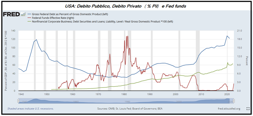 Powell sembra aspirare al ruolo di due precedenti Presidenti della FED, Paul Volcker (agosto 1979 – agosto 1987) per l’aggressività sui tassi e di Alan Greenspan (agosto 1987 – gennaio 2006) per la retorica delle dichiarazioni. Ma Volcker ha alzato i tassi in un periodo in cui il debito pubblico e privato in USA erano un terzo degli attuali, e i Fed Funds nel decennio precedente, erano stati in media attorno al 6/7%. Negli ultimi 13 anni i Fed Funds hanno raggiunto al massimo il 2.5% e sono stati a 0.25% per 9 anni cumulativi (v. grafico):