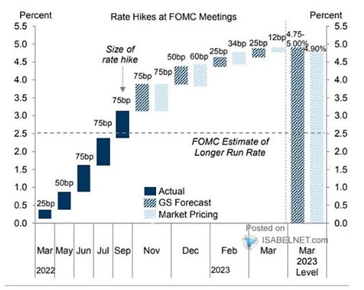 L’incertezza del mercato non riguarda quindi l’esito della settimana scorsa, ma quello che potrebbe arrivare a partire dai prossimi mesi. Già per dicembre (il 14 ndr.) guardando i prezzi dei futures sui Fed Funds il mercato sconta un esito incerto al 50-50 tra altri 75 bps oppure 50 bps. Per i primi meeting del 2023, invece, il mercato vede ancora due aumenti ma in questo caso da 25 bps come mostrato dal grafico di GS qui sotto in cui sono poste a confronto le attese della banca con il prezzo di mercato.