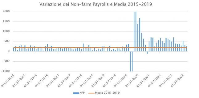 E veniamo agli importanti dati macroeconomici usciti nella settimana appena trascorsa che, ad onor del vero, hanno gravato sul sentiment riportando risultati più forte delle attese (v. ISM manifatturiero e Job openings di settembre in rialzo) e quindi hanno indotto i mercati finanziari a ridurre la probabilità di una FED accomodante. In particolare gli investitori sono stati infastiditi dai segnali che la domanda di lavoro resta molto forte. Anche il dato sui nuovi occupati non agricoli (NFP), molto seguito dalla FED, uscito a 261.000 (68.000 sopra attese, con revisioni positive nel dato precedente), è vero che fa registrare un rallentamento rispetto alla crescita media dei NFP registrata da inizio anno di 420.000 e ancora più distante da quella del 2021 superiore ai 560.000, ma questi sono numeri distorti dalla pandemia e un ritmo di crescita di 200.000 al mese rimane comunque un ritmo di crescita robusto per il mercato del lavoro USA e in linea con la media degli ultimi anni pre-pandemia.
