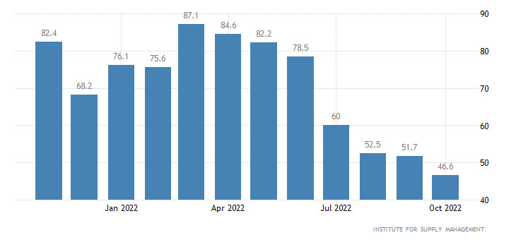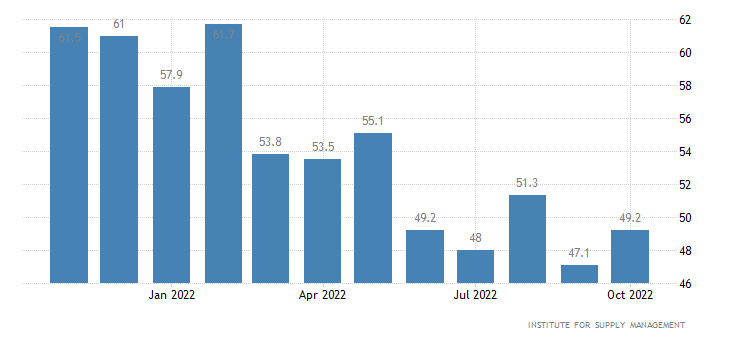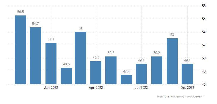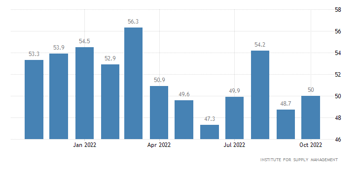 Anche l'ISM manifatturiero ha sorpreso in positivo, in questo caso però scendendo meno delle attese, ma sempre ai minimi da maggio 2020. Il dato di ottobre è pari a 50,2 punti, appena oltre al consensus di 50,0 punti e, come detto, in calo rispetto ai 50,9 punti del mese di settembre.