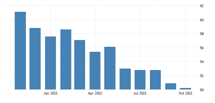 Interessante, sul fronte inflazione, l’indice dei prezzi ad ottobre è pari a 46,6 punti, in calo rispetto ai 51,7 punti di settembre, segnalando una discesa per la prima volta da maggio 2020.