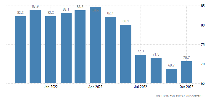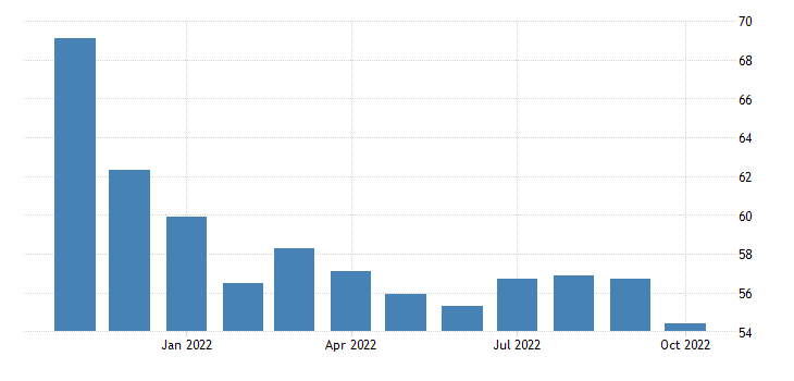 Mentre tutti i dati del settore dei servizi rilasciati da ISM segnano una contrazione ad ottobre ad eccezione dei prezzi. Il PMI si attesta a quota 54,4 punti, segnando una contrazione rispetto al dato di 56,7 punti di settembre, una contrazione superiore a quella indicata dal consensus fissato a 55,5 punti. La lettura è al minimo da maggio 2020.