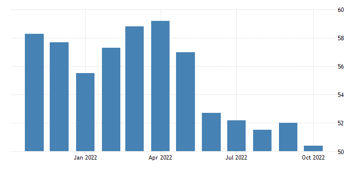 L’indice relativo a quello dei nuovi ordini passa dai 60,6 punti di settembre ai 56,5 punti di ottobre.