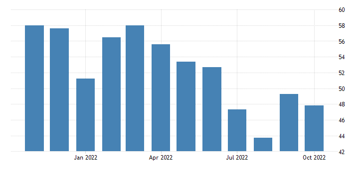 Il PMI S&P Global del settore dei servizi è stato rivisto al rialzo, ma rimane sempre in contrazione dai 49,3 punti di settembre ai 47,8 punti di ottobre; il dato preliminare di ottobre era pari a 46,6 punti. Il dato è rilasciato da Markit Economics.
