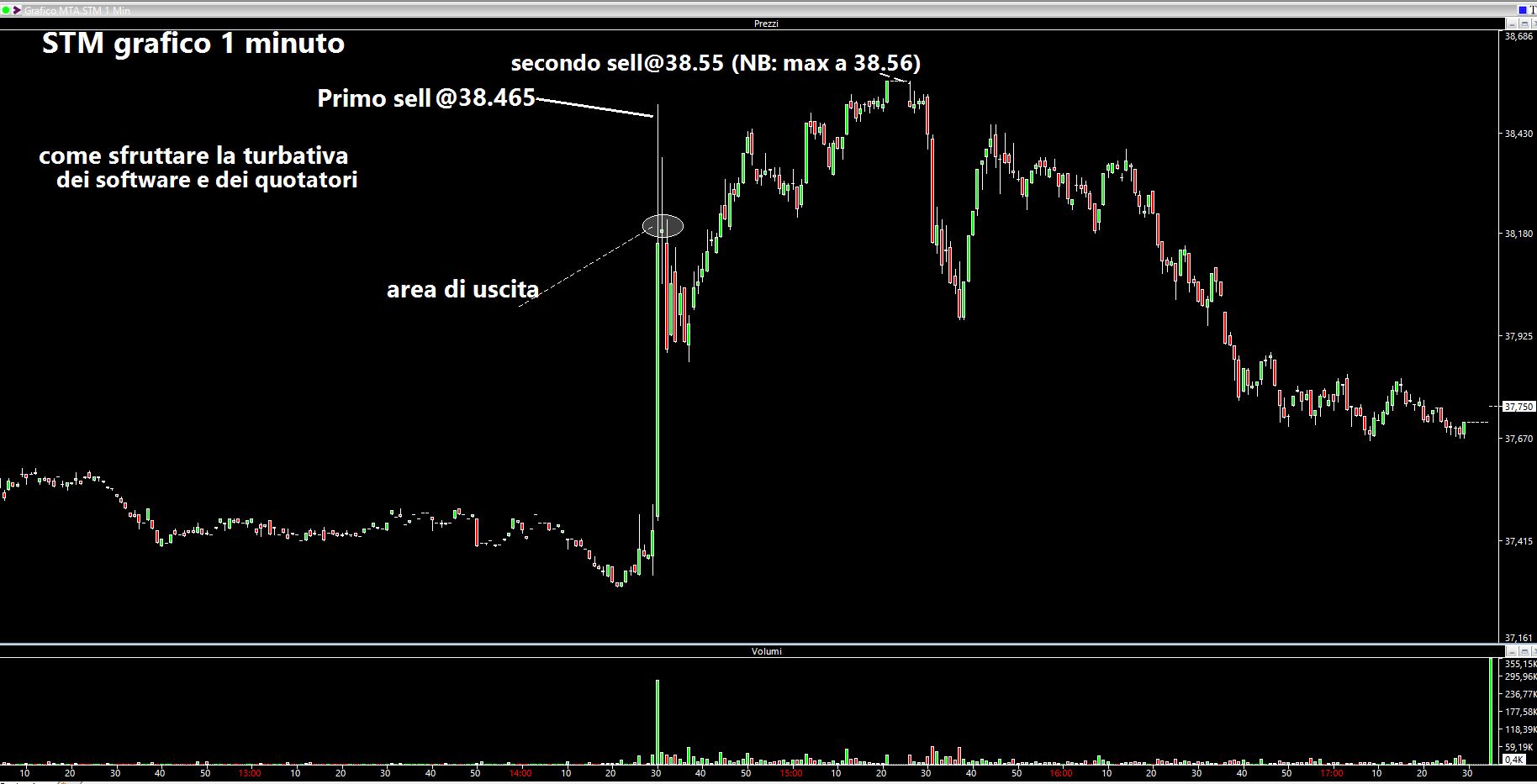 Sfruttando la turbativa di mercato indotta dai software di negoziazione e dai quotatori ed in virtù di quanto scritto sopra e sabato scorso (alta probabilità di falso movimento) ho selezionato il titolo STM impostando chiaramente una operatività short. Esce il dato delle 14.30 e sapevamo che "molto probabilmente" sarebbe stato più basso (fattore molto positivo per il mercato). Le Borse partono al rialzo, le macchinette assorbono la poca liquidità e si "scannano" tra di loro (mi riferisco a quelle tarate in modalità one-way che si scontrano con i quotatori). Non appena i quotatori bid/ask non riescono più a stare dietro al rialzo ecco che rimangono solo le prime, i book si "rompono" e questo ha permesso un piccolo sell a 38.465 euro (primo massimo di giornata). Ovviamente in questi casi non si punta al grande utile ma ci si accontenta chiudendo il trade a 38.20 solo dodici secondi più tardi. C'è un PERO'. Come scrivevo poco fa i software sono stupidi (sono formule matematiche) e non ragionano e questo è un grandissimo vantaggio per il trader perché operano solo in velocità. Quindi non appena il mercato si assesta e rallenta (in questo caso mi riferisco al titolo STM) ecco che vanno nuovamente alla ricerca dello stesso massimo con un delta di pochi tick. E questo ha poi permesso un secondo trade in sell esattamente a 38.55 euro (il massimo di giornata è stato a 38.56 euro). Da quel punto il titolo è solo sceso. Questo è chiaramente un modo per operare in determinati frangenti sfruttando appunto l'ignoranza e la velocità degli algoritmi e soprattutto l'illiquidità che a mio avviso rappresenta un GRANDE rischio sistemico, tanto più che la mole di strumenti derivati, compresi gli ETF ed i certificati, rischia di non trovare una controparte ad "assorbire" il movimento del sottostante. Insomma: abbiamo azioni/mercati che scambiano poco (=hanno i piedi d'argilla) sulle cui fondamenta sono stati costruiti grattacieli (etf e certificati ad esempio). My point of view.