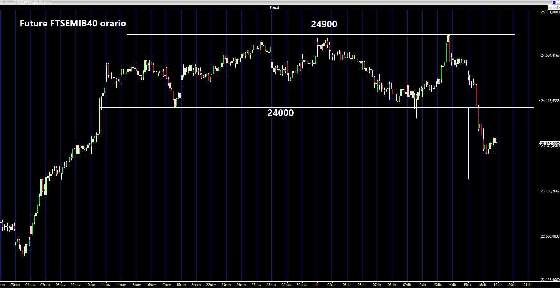 Osservando un timeframe orario non sono da escludere tentativi di pullback verso il vecchio supporto, ora resistenza, in area 24000 livello anche psicologico. Faccio notare che se prima il nostro indice e derivato erano ingabbiati in un rettangolo con base 24000 e resistenza 24900 (900 punti di altezza totale), ecco che proiettando verso il basso tale altezza dal punto di rottura otteniamo un'area target proprio attorno a 23150 punti.