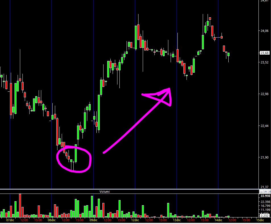 Nel caso che esamineremo abbiamo una azione che alle ore 10.47 del mattino ha scambiato circa 38 mila pezzi per un controvalore attorno a 850 mila euro. Direi non illiquida.