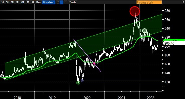 La successiva ondata di debolezza sui mercati ha determinato una flessione del titolo che ha rotto la media mobile a 200 giorni (linea verde) spingendosi fino a circa $180.