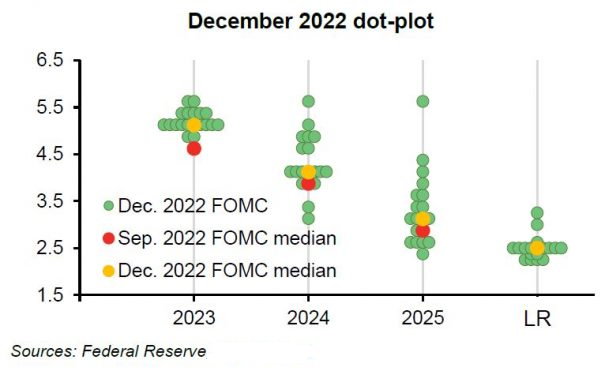 Quella appena terminata è stata la settimana del FOMC. L’organo della banca centrale statunitense mercoledì scorso, come atteso, ha annunciato un ulteriore rialzo dei tassi, portando il tasso d’interesse di riferimento al suo livello più elevato in 15 anni. Nell’ultimo incontro, dopo quattro rialzi consecutivi dello 0,75%, il FOMC ha optato per un aumento dei tassi di mezzo punto, facendoli entrare in un range compreso tra il 4,25% e il 4,50%. Dalla riunione di mercoledì scorso, tramite il grafico “dot plot” sono emerse anche indicazioni su quelle che sono le attese sul cammino del rialzo dei tassi: il “terminal rate”, punto nel quale i funzionari si aspettano di fermare gli aumenti, è stato posizionato al 5,1%. Inoltre, non si prevedono riduzioni fino al 2024. A seguire, il consensus è per una riduzione dei tassi dell’1% nel corso del 2024, per arrivare ad un livello riferimento del 4,1% entro fine anno. A settembre le indicazioni erano rispettivamente al 4.6% e 3.9%.
