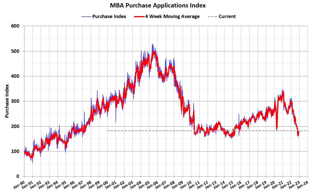 Il quadro sull'immobiliare residenziale USA continua ad essere ben chiaro. I prezzi stanno scendendo rapidamente, e l'approdo massiccio sul mercato di case che si stanno ultimando, metterà ulteriore pressione. Le cancellazioni in forte crescita fanno sì che i numeri ufficiali sovrastino le vendite e sottostimino le scorte. Il seguente grafico del MBA Purchase application index (richieste di mutuo per acquisti casa è ai minimi del decennio più o meno, in calo del 38% rispetto all'anno scorso) ci permette di contestualizzare il movimento.