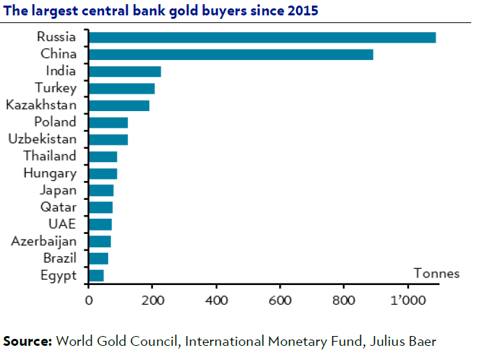 Negli ultimi anni, le banche centrali dei paesi in via di sviluppo sono diventate importanti acquirenti di oro, riportando le riserve auree totali ai livelli visti l'ultima volta negli anni '90, intorno alle 37.000 tonnellate. Poiché gli acquisti della banca centrale in genere avvengono dietro le quinte, difficilmente fanno notizia. Tuttavia, la notizia dei recenti acquisti ha creato scalpore nel mercato dell'Oro, non solo per il volume di quasi 400 tonnellate durante il terzo trimestre di quest'anno, circa 20 miliardi di dollari, il massimo in oltre mezzo secolo, ma anche perché la maggior parte di esso non poteva essere assegnata a una specifica banca centrale.