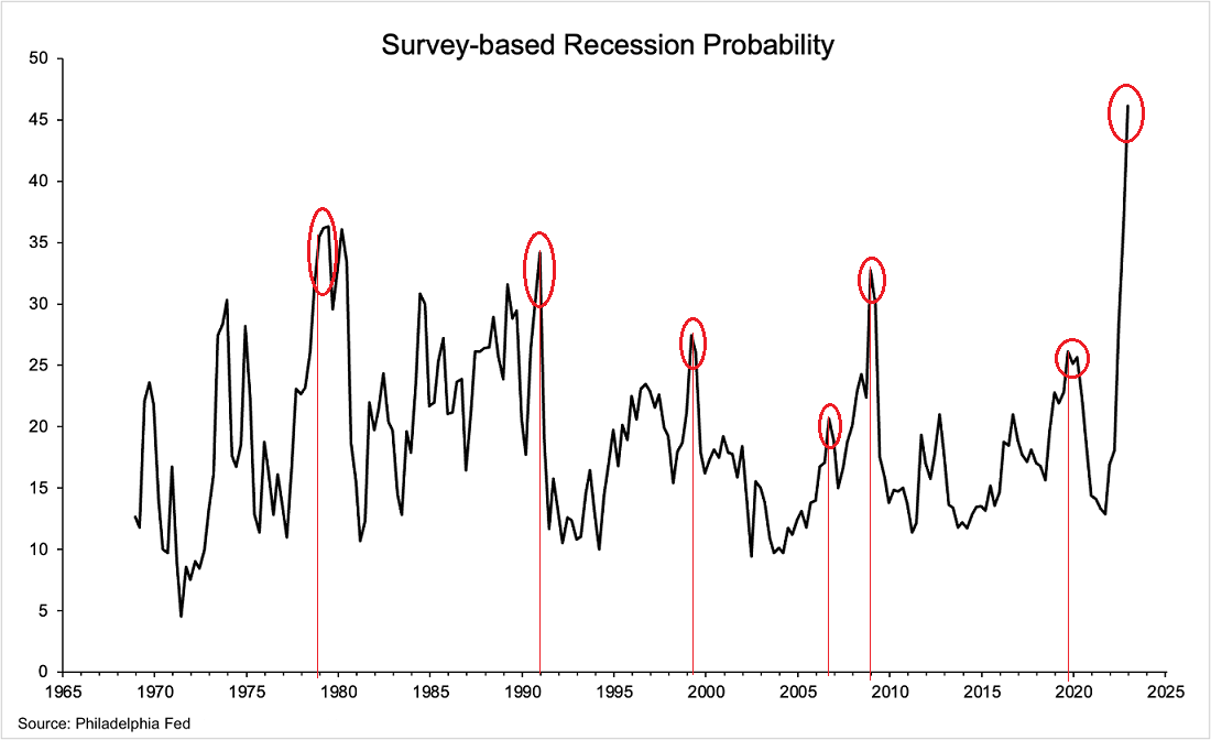 Per una più completa informazione ed andando contro la nostra visione non pessimista dei mercati, è interessante notare che la previsione macroeconomica più antica esistente, la Survey of Professional Forecasters a cura della FED di Philadelphia, partita nel 1968, riporta la probabilità più elevata di una recessione negli USA della sua storia con quasi il 50% di probabilità. A prima vista potrebbe sembrare un indicatore contrarian, ma guardando ben il seguente grafico, si nota che il track record della previsione è abbastanza preciso nel segnalare, correttamente, i precedenti picchi alla vigilia o durante le contrazioni del 73-74, '79-'81, '90, 2001, e 2007-2009.