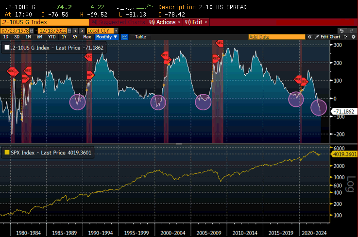 Ovviamente rimarchiamo il fatto che il passato non è certezza del futuro e che l’attuale conteggio è solo previsionale, ma la logica impone che se un numero sostanzioso di economisti (ed i loro relativi modelli) prevedono una recessione, è improbabile che sia blanda come ci vuol far credere la FED, soprattutto con un DOT PLOT di questa portata e con prospettive di un mantenimento nel tempo di tassi alti. Quindi se recessione sarà, si tratterà di un fenomeno significativo per non dire severo.