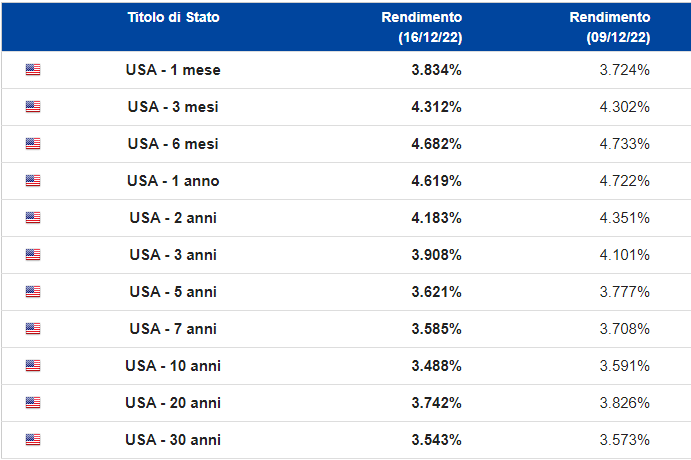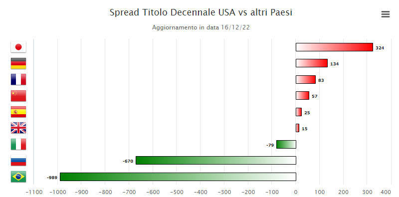 Infine riportiamo lo spread del Treasury decennale USA rispetto all'omologo titolo dei principali paesi mondiali a venerdì 16 dicembre.