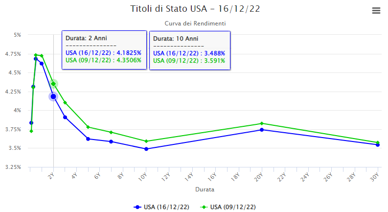 Ecco il grafico comparativo settimanale delle varie scadenze tra la chiusura di lunedì scorso 12 dicembre e l’intraday di oggi 19 dicembre che non mostra particolari differenze: