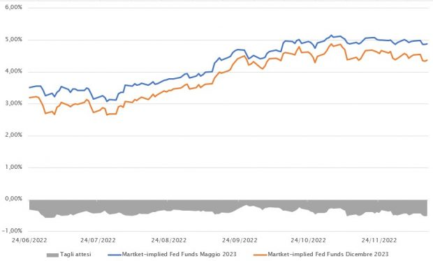 Gli operatori del mercato monetario prevedono altri due aumenti di 25 punti base il prossimo anno, portando il tasso terminale al 4,82% entro maggio. La banca centrale degli Stati Uniti, nella sua battaglia contro l'inflazione decennale, quest'anno ha alzato il tasso ufficiale di 375 punti base fino a un intervallo del 3,75%-4,00% da quasi zero, il ritmo più veloce di rialzi dei tassi dagli anni '80. I timori che aumenti aggressivi dei tassi d'interesse da parte delle principali banche centrali possano far precipitare l'economia globale in una recessione hanno colpito quest'anno gli asset rischiosi come le azioni.