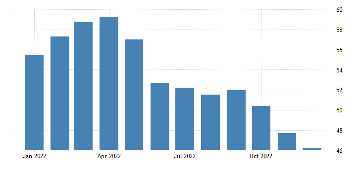 Sui PMI USA il ritmo di contrazione è decisamente aumentato sia su manifatturiero che, soprattutto, sui servizi, facendo segnare il minimo da 2 anni e mezzo. Anche gli analisti di S&P Global hanno osservato che i rialzi della FED stanno ottenendo l'effetto desiderato sull'inflazione, ma a costo di un crescente rischio recessione. Il dato preliminare di dicembre del PMI S&P Global del settore manifatturiero si attesta a quota 46,2 punti; rilevazione inferiore al dato di novembre, di 47,7 punti.