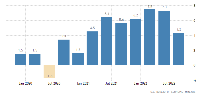 Il PIL statunitense del terzo trimestre, alla terza lettura, è stato rivisto al rialzo. I dettagli sono buoni, con i consumi che salgono e le scorte più basse. Il dato trimestrale dell’indice realizza una crescita del 4,4%, in linea con il secondo dato preliminare del +4,3%. Comunque in deciso rallentamento rispetto al secondo trimestre dall’anno, che ha fatto segnare un +9,0%. Il dato è rilasciato dall’U.S. Bureau of Economic Analysis.