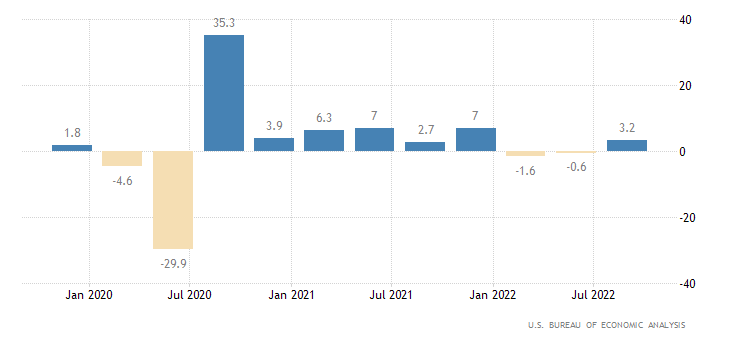 Dopo il -0,6% del secondo trimestre, il PIL annualizzato cresce del 3,2% nel terzo trimestre. Crescita superiore al dato preliminare del +2,9%. Il dato è rilasciato dall’U.S. Bureau of Economic Analysis.