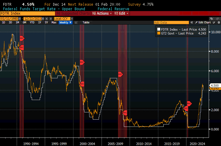 Vedendola da un’altra angolatura, nonostante la retorica stringente della FED, il 2Y sta passando sotto il livello dei Fed Funds. Tutte le volte che quest'incrocio è avvenuto, negli ultimi 30 anni, è significato che la FED aveva alzato troppo i tassi e aveva dovuto successivamente tagliarli. Solo negli anni '90 quest'evento non è stato seguito da una recessione, anche se nel 2020 la recessione l’ha causata il COVID e non è chiaro se i tagli operati della FED l’avrebbero evitata o meno. Sta di fatto che tempo 6/7 mesi gli USA entreranno nella recessione più prevista della storia cui farà seguito quella globale.