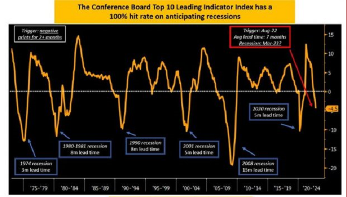 Martedì scorso, Wall Street ha interrotto la serie negativa di 5 sedute (S&P 500 +0.1%) ma con una salita stiracchiata, tanto che il Nasdaq 100, zavorrato da Tesla, non è nemmeno riuscito a restare in progresso (-0.11%). Ma è nella giornata di mercoledì scorso che si è assistito ad un ottimo rimbalzo degli indici vanificato dal mega ribasso del giorno successivo senza spiegazioni di sorta se non l’uscita del PIL USA del terzo trimestre rivisto al rialzo, ma è un dato che riporta una situazione vecchia, già passata. Sicuramente il mercato del lavoro continua a rimanere su livelli robusti (v. Jobless Claim) e sui consumi, fornendo un segnale di resilienza dell’economia a stelle e strisce, forse per questa ragione che i mercati finanziari vorrebbero vedere dati occupazionali un po' più deboli in quanto, finché non si indeboliscono la FED continuerà a darci dentro coi rialzi, visto che guarda principalmente a quello. Di contro il dato sui Leading Indicator è stato interpretato effettivamente per quello che è, e quindi vale a dire come una “bad news”. L’indice LEI del Conference Board è uscito molto debole contraendosi di un altro 1% a novembre portando il dato anno su anno al -4.5%. Ogni volta che la variazione del dato anno su anno è stata negativa per almeno due mesi di fila, si è materializzata una recessione in media con un ritardo di 7 mesi (v. grafico seguente). Ecco il motivo per il quale non si giustifica il forte ribasso di giornata (con un intraday molto più profondo) solo parzialmente mitigato in chiusura di contrattazioni.