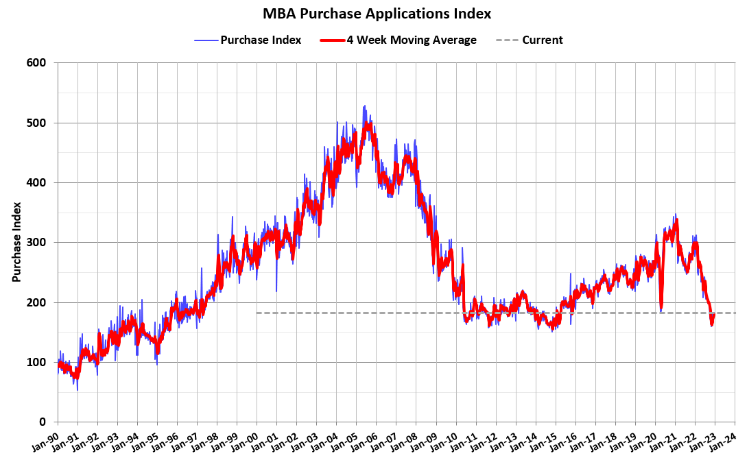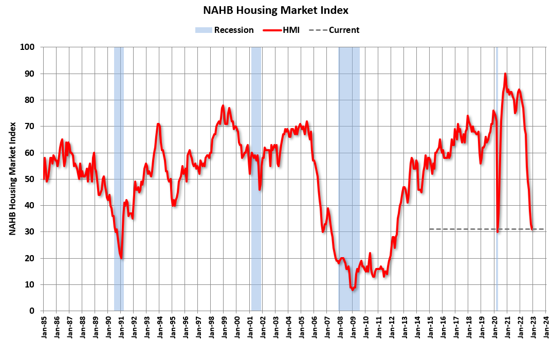 Il Chief Economist del NAHB, Robert Dietz, ha dichiarato che la discesa di soli 2 punti potrebbe indicare che siamo vicini al bottom, in effetti. Il punto è che sembra improbabile che il settore si riprenda molto rapidamente, visto il problema di convenienza, l'ondata di cantieri in corso di completamento, la FED ancora aggressiva, etc.