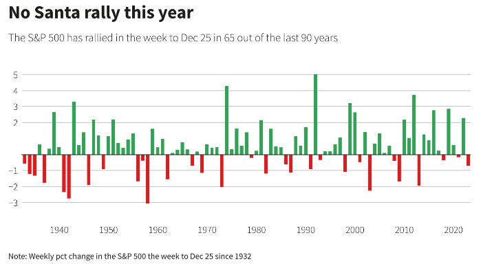 Purtroppo quest’anno è andata così. Anche se l’indice S&P500 ha chiuso la settimana con una modesta perdita del -0,20%, è sulla buona strada per un calo del 6,3% questo mese, il quarto peggior dicembre mai registrato, con il primo posto nel dicembre 1931, quando è sceso del 14,53%, seguito dal 2018, con un calo del 9,4%, e dal 1930, quando ha perso il 7,4%. Sembrerà strano, ma il più grande rally di Babbo Natale è stato fatto sotto l’era del Presidente della FED, Alan Greenspan, noto pessimista dei mercati azionari, con un enorme guadagno settimanale del 5% nel 1991, subito dopo aver tagliato i tassi di interesse di tre quarti di punto - il massimo in un mese dalla fine del 1984 - mentre combatteva un'economia lenta e alta disoccupazione (v. grafico):