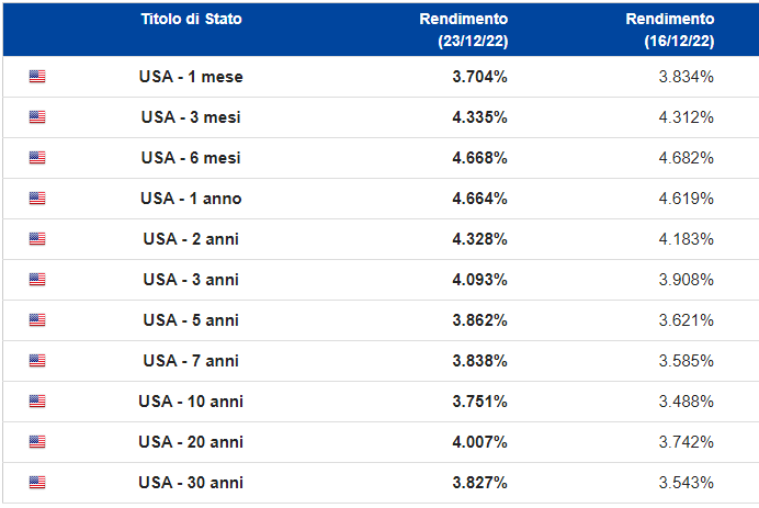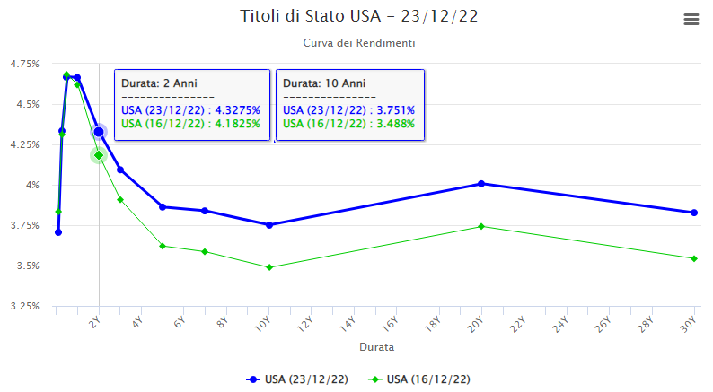Nel grafico comparativo settimanale delle varie scadenze tra la chiusura di due venerdì fa 16 dicembre e la chiusura di venerdì scorso 23 dicembre si notano sostanziali differenze con quasi tutte le scadenze al rialzo: