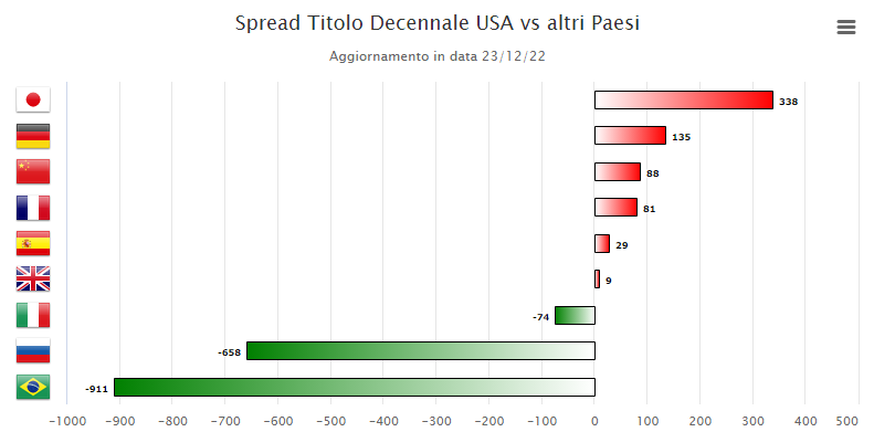 Infine riportiamo lo spread del Treasury decennale USA rispetto all'omologo titolo dei principali paesi mondiali a venerdì 23 dicembre.
