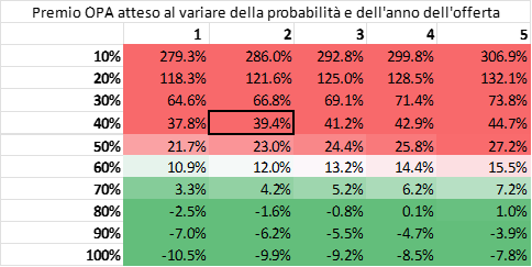 Per avere un metro di paragone, in questo caso, ci viene in aiuto un paper della Consob uscito nel 2021, che ha studiato le OPA avvenute in Italia dal 2007 al 2019: https://www.consob.it/documents/46180/46181/dp9.pdf/f8429feb-52f3-43b7-a149-0e035a1b6119.