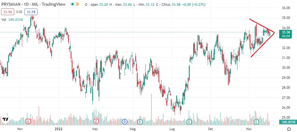 Il triangolo ampio che si sta formando attualmente ci impone di stare allerta e di prestare attenzione ad eventuali cambiamenti di trend. Dopo lo scossone estivo di azioni Prysmian la situazione che si presenta davanti a noi è quella di una congestione larga che potrebbe sbloccarsi con un botto al rialzo complice un possibile rally di Natale. I volumi sono buoni (come sempre del resto, i poteri forti ci sono quando le azioni sono buone). Nel corso del 2022 l’azione ha oscillato in orizzontale senza troppa convinzione per finire sempre più in alto tanto che ora siamo ad un passo dai massimi storici. Anche adesso il trend timidamente rialzista in corso ha raggiunto i livelli di fine 2021 e sta continuando a salire.