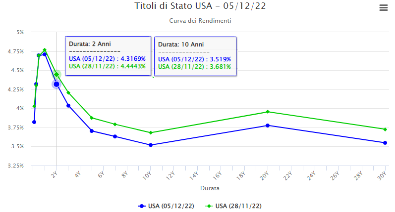 Ecco il grafico comparativo settimanale delle varie scadenze tra la chiusura di lunedì scorso 28 novembre e l’intraday di oggi 05 dicembre: