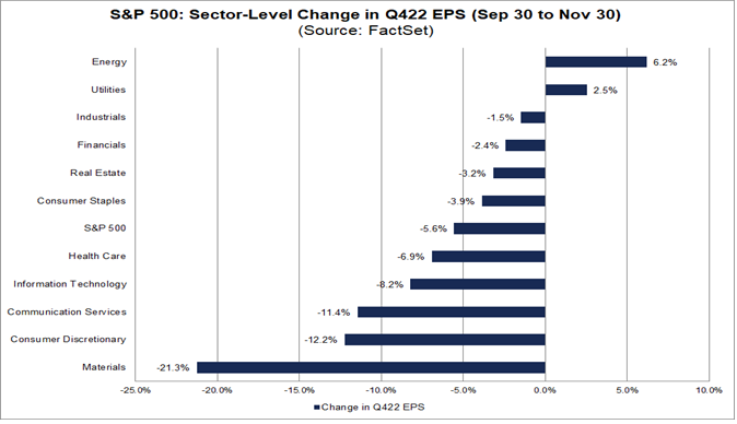 A livello di settore, nove degli 11 settori hanno registrato una diminuzione della loro stima degli utili per il quarto trimestre 2022 dal 30 settembre al 30 novembre, guidati dai settori dei Materiali (-21,3%), Beni di consumo discrezionali (-12,2%) e Servizi di comunicazione (-11,4%). D'altra parte, due settori hanno registrato un aumento della loro stima bottom-up degli utili per il quarto trimestre 2022 durante questo periodo, guidati dal settore Energia (+6,2%) e Pubblica utilità (+2,5%).