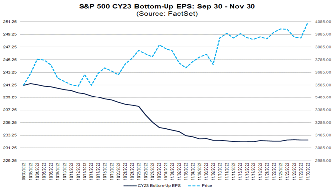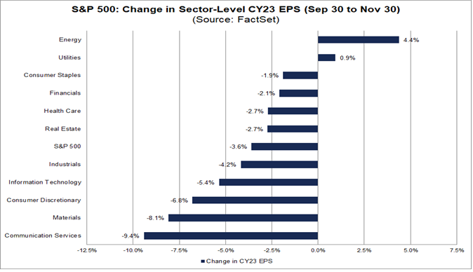 A livello settoriale, nove settori hanno registrato una diminuzione della loro stima bottom-up degli utili per l'anno fiscale 2023 dal 30 settembre al 30 novembre, guidati dai settori dei Servizi di comunicazione (-9,4%), Materiali (-8,1%) e Beni di consumo discrezionali (-6,8%) settori. D'altra parte, due settori hanno registrato un aumento della loro stima degli utili per l’anno 2023 durante questo periodo, guidati dal settore Energia (+4,4%) e Pubblica utilità (+0,9%).
