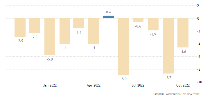 A livello mensile, ad ottobre il dato sulle vendite immobiliari in corso (che misura il cambiamento nel numero di case con contratto di vendita, ma in attesa della transazione di chiusura, escludendo le nuove costruzioni) segna un -4,6%, contro una rilevazione di settembre del -8,7% (rivista da -10,2%), ma il dato anno su anno a -36% la dice lunga sull'andamento dei compromessi, che si trasformano in vendite entro 45-60 giorni. Il dato è rilasciato dalla National Association of Realtors.