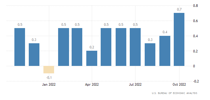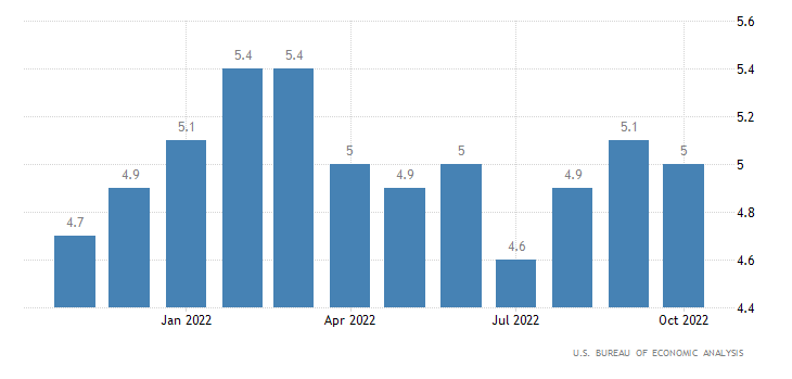 A livello annualizzato, la crescita di ottobre è del 5%, come previsto dal consensus. A settembre era stato registrato un +5,2% (rivisto da +5,1%). I dati sono rilasciati dall’U.S. Bureau of Economic Analysis.