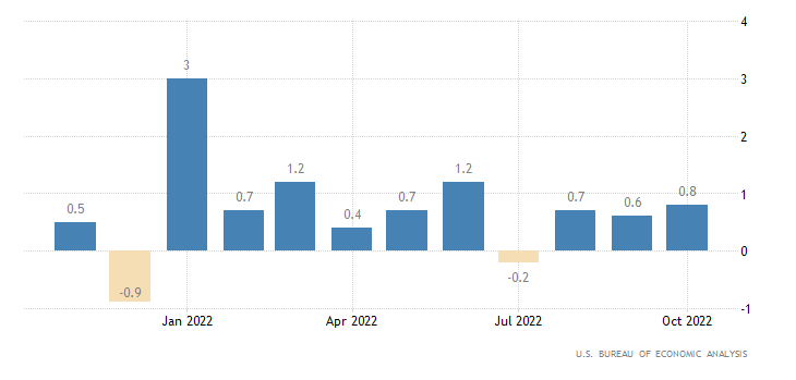 Il dato preliminare del terzo trimestre del PIL annualizzato segna una crescita del 2,9%, poco sopra al precedente dato preliminare del +2,6%. Nel primo e nel secondo trimestre del 2022 erano stati registrati dati rispettivamente del -1,6% e -0,6%. Il dato è rilasciato dall’U.S. Bureau of Economic Analysis.
