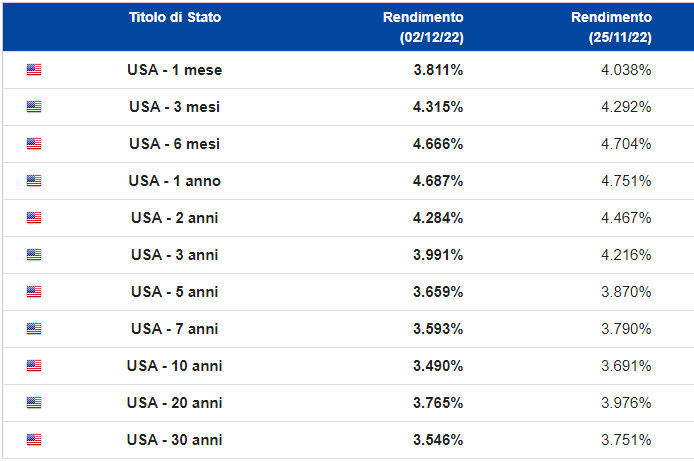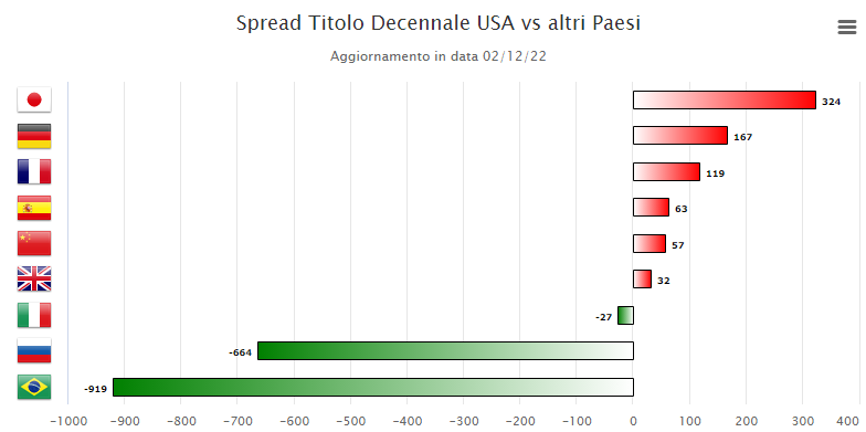 Infine riportiamo lo spread del Treasury decennale USA rispetto all'omologo titolo dei principali paesi mondiali a venerdì 02 dicembre.