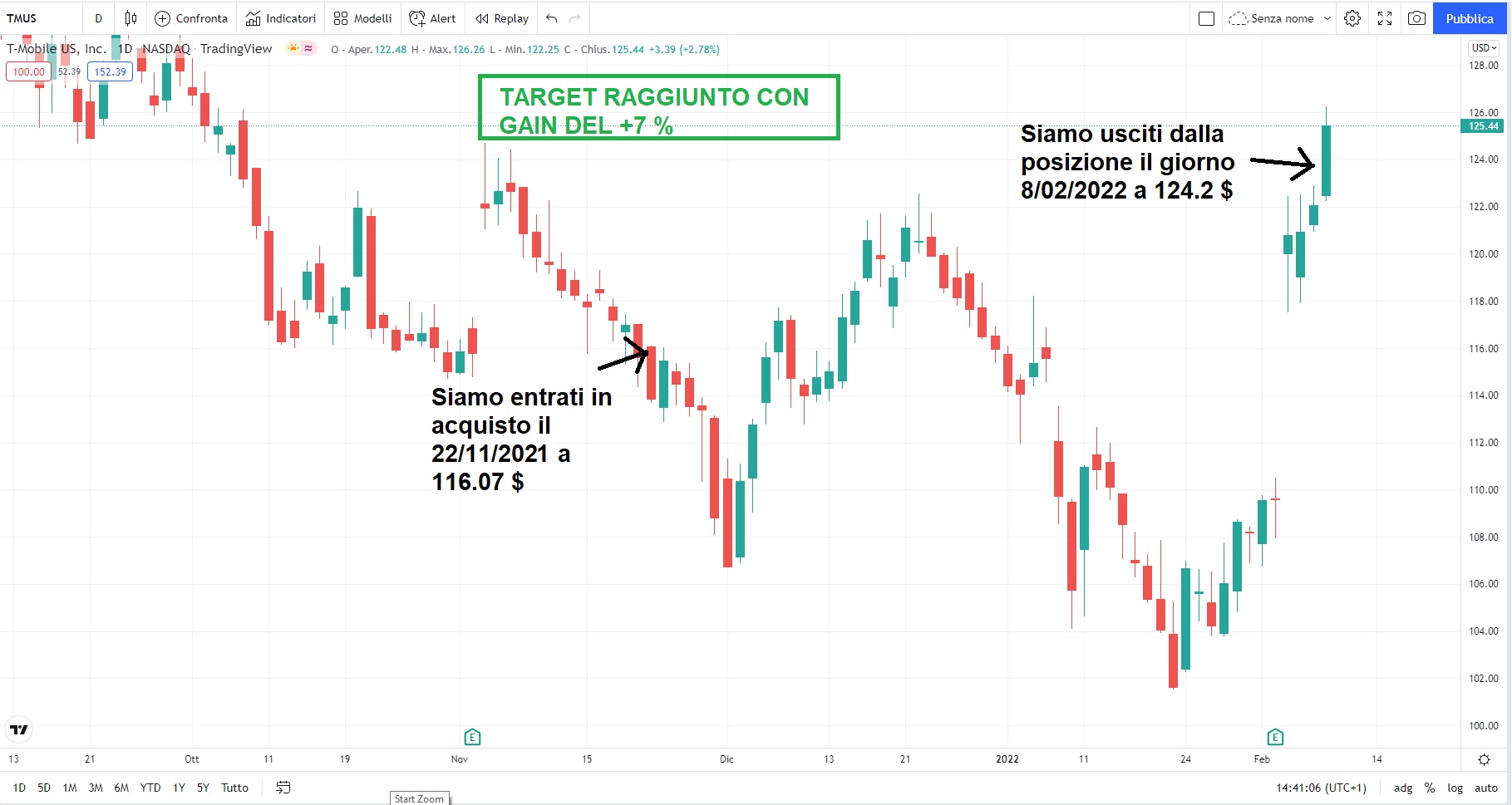 Come potete vedere dal grafico siamo entrati in regime di acquisto il 22/11/2021 ad un prezzo di 116.07 $ e siamo usciti dalla posizione il giorno 8/02/2022 a 124.2 $, dopo aver messo un prezzo di stop a 98.65 $.