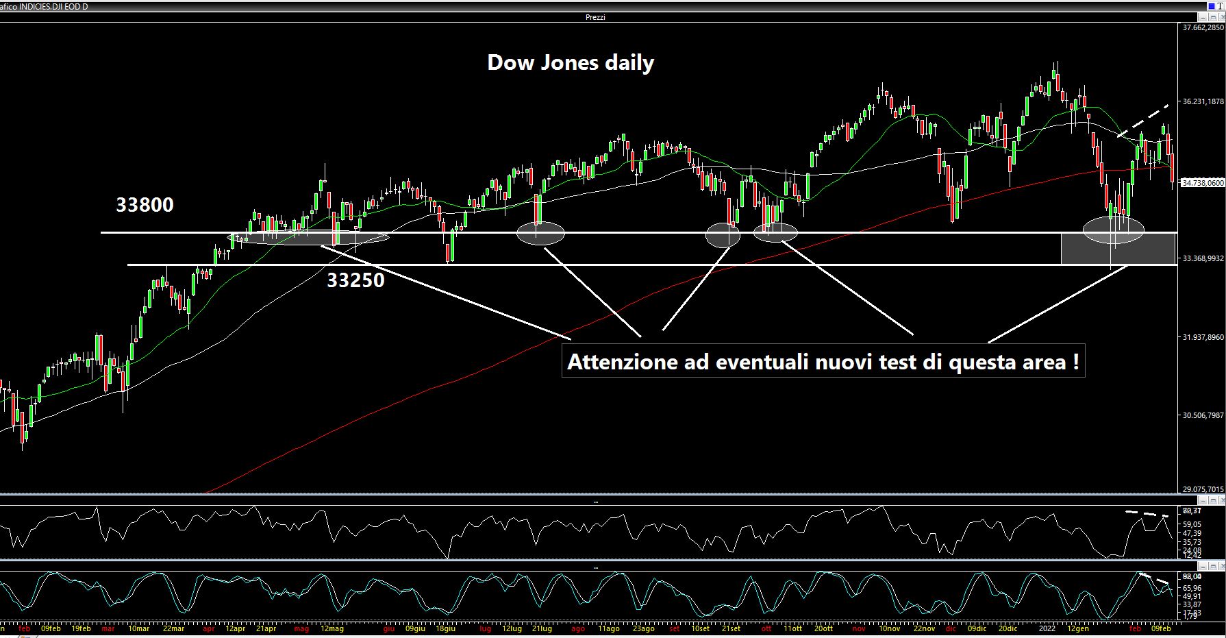 Sul Dow Jones i livelli "calamita" sono posti a 33800 e 33250 con qualche divergenza che si è formata sugli oscillatori nel corso dell'ultimo rimbalzo. Faccio poi notare che nell'ultima seduta settimanale l'indice ha nuovamente rotto al ribasso la media a 200 periodi che transita attorno a 35000 punti. Importante quindi che i valori tornino al di sopra di tale soglia per scongiurare un ulteriore affondo. Faccio poi notare che si sono create delle divergenze ribassiste tra oscillatori ed indice: a massimi crescenti dell'ultimo rimbalzo non sono seguiti massimi crescenti sugli oscillatori quindi c'è stata nel complesso una perdita di forza.