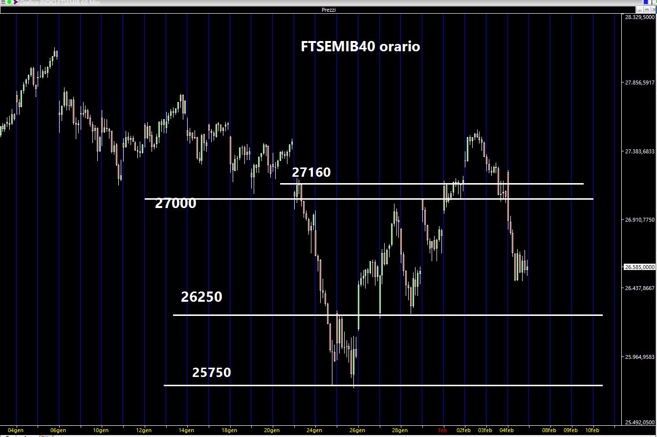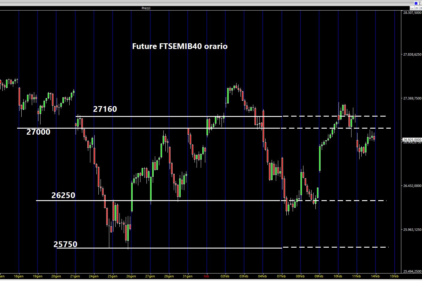 Per la settimana entrante monitorerò i seguenti livelli sul future FTSEMIB40 italiano scadenza marzo: al rialzo 27000 e 27300 mentre al ribasso i 26100 e poi i 25750.