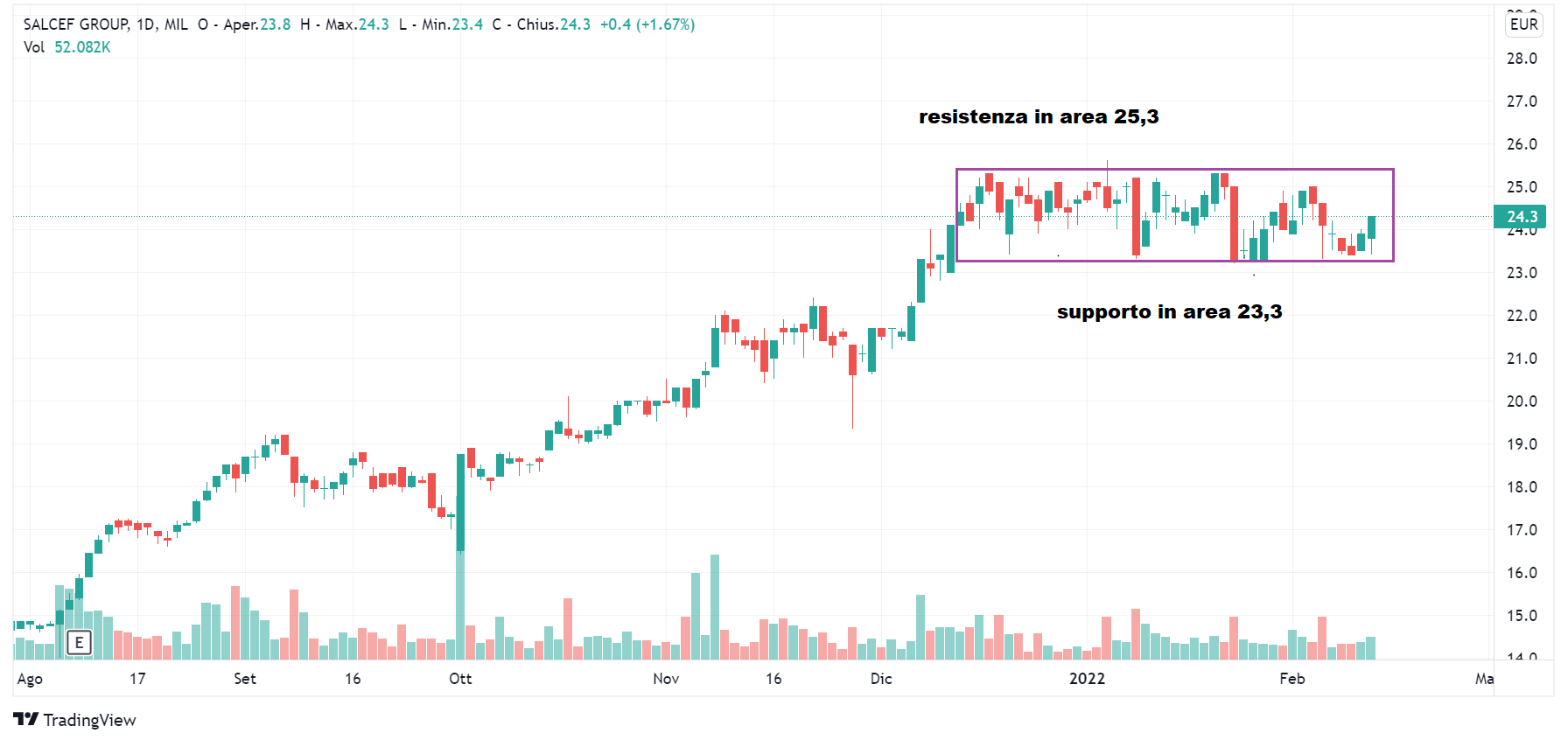 Ora andiamo a rispolverare il titolo Salcef Group (sabato Lombard Stock Index di 30). Come prima cosa osservando il grafico possiamo dire che il movimento laterale del titolo, iniziato intorno a metà dicembre, è ancora in atto. L’ultima volta che avevamo trattato Salcef Group (https://www.lombardreport.com/2022/1/29/azioni-renergetica-e-azioni-salcef-group-cosa-ci-mostra-il-lombard-stock-index/), analizzando il rettangolo presente sul grafico, avevamo indicato come area di resistenza 25,3 ed area di supporto 23,3. E il rettangolo resta ancora all’interno di questi due “limiti”. Dalla seduta del 31 gennaio a quella dell’11 febbraio, infatti, resistenza e supporto non sono stati rotti. La resistenza di 25,3 è stata sfiorata il 3 febbraio quando è stata registrata una quotazione di 25,0; il supporto di 23,3 invece è stato toccato il 4 febbraio e sfiorato in diverse altre occasioni.