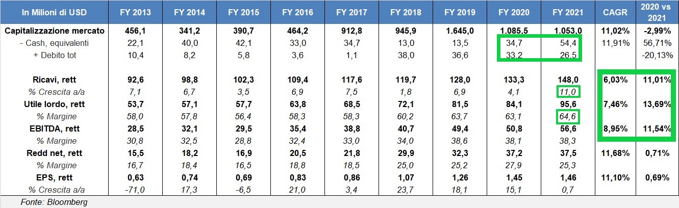 I ricavi sono cresciuti ad un tasso record, la marginalità rimane elevata ed i flussi di cassa generati dal core business conferiscono alla struttura patrimoniale un’ottima solidità.