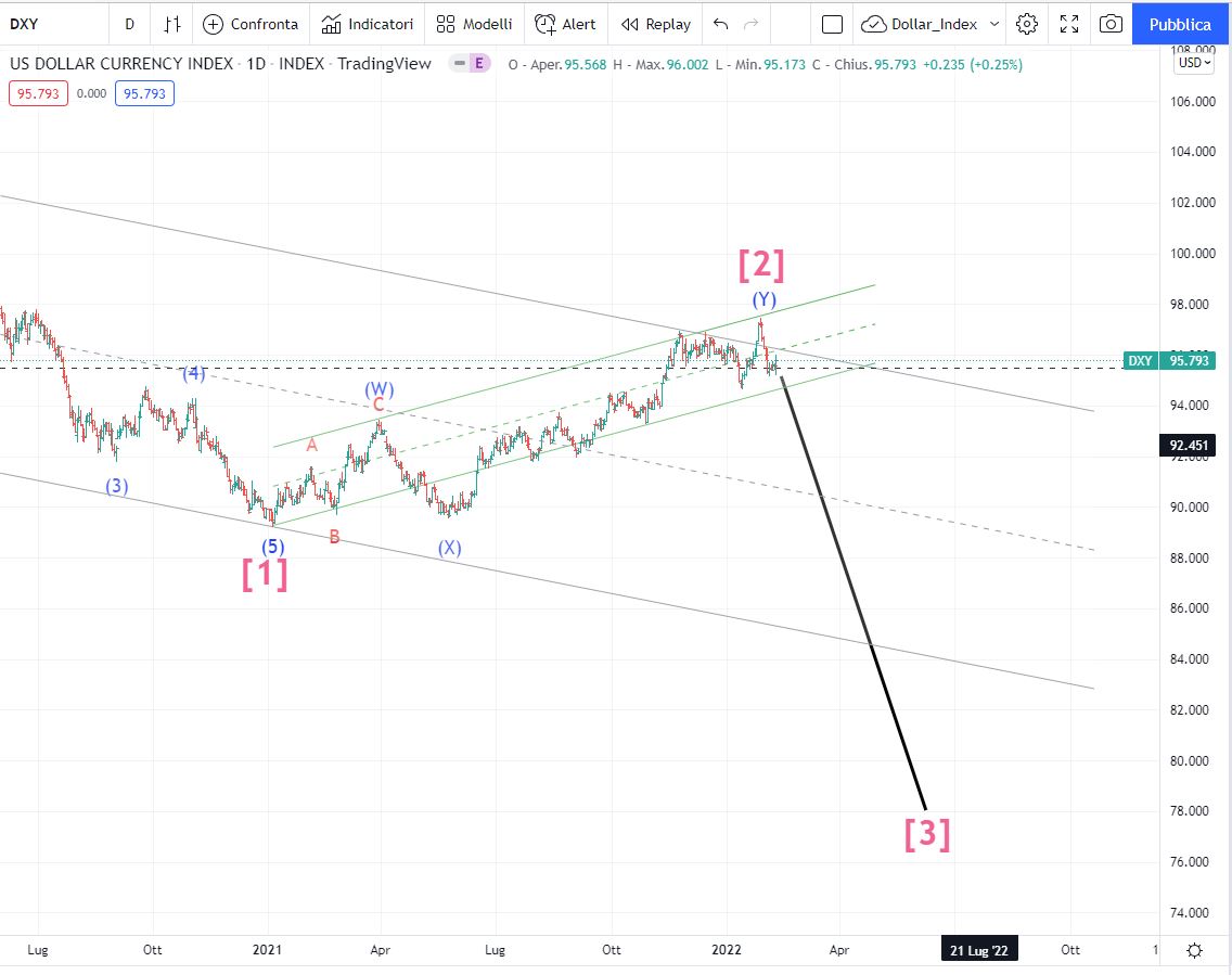 Il Dollar Index , sta ora impostando l’onda [III] e dovrebbe rompere presto il canale di trend ascendente. In quell’occasione dovremmo assistere anche ad una accelerazione della spinta ribassista. L’euro per contro salirà.
