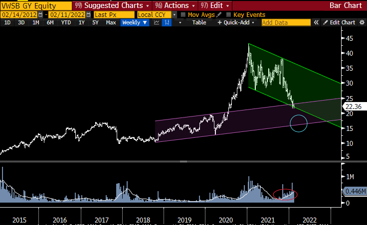 Nell’intento di individuare qualche supporto interessante, l’area situata attorno a 19,50, vedi il massimo relativo di pre covid e, in caso di debolezza prolungata, il doppio livello di supporto di 17/16 sembrano in grado di respingere la pressione ribassista.