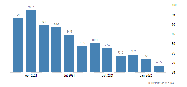 Il sottoindice sulle attuali condizioni economiche mostra un dato preliminare di febbraio di 68,5 punti, il più basso da agosto 2011 ad oggi. Anche in questo caso il dato preliminare è sotto al consensus (73 punti) e al dato di gennaio (72 punti).
