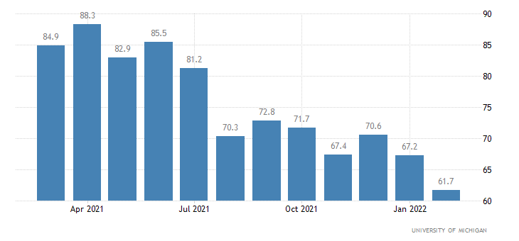 Il dato preliminare di febbraio sulla fiducia dei consumatori elaborato dalla University of Michigan scivola a 61,7 punti registrando il dato più basso da ottobre 2011. La rilevazione si attesta ampiamente sotto al consensus di 67,5 punti e al dato di gennaio pari a 67,2 punti.