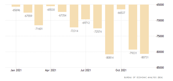 Nel mese di dicembre la bilancia commerciale tra beni e servizi degli USA (differenza tra beni e servizi importati ed esportati) si attesta a -80,7 miliardi di dollari contro un consensus fissato a -83 miliardi di dollari ed un dato di novembre di -79,3 miliardi di dollari (rivisto da -80,2 miliardi). Il dato è rilasciato dall’U.S. Bureau of Economic Analysis.