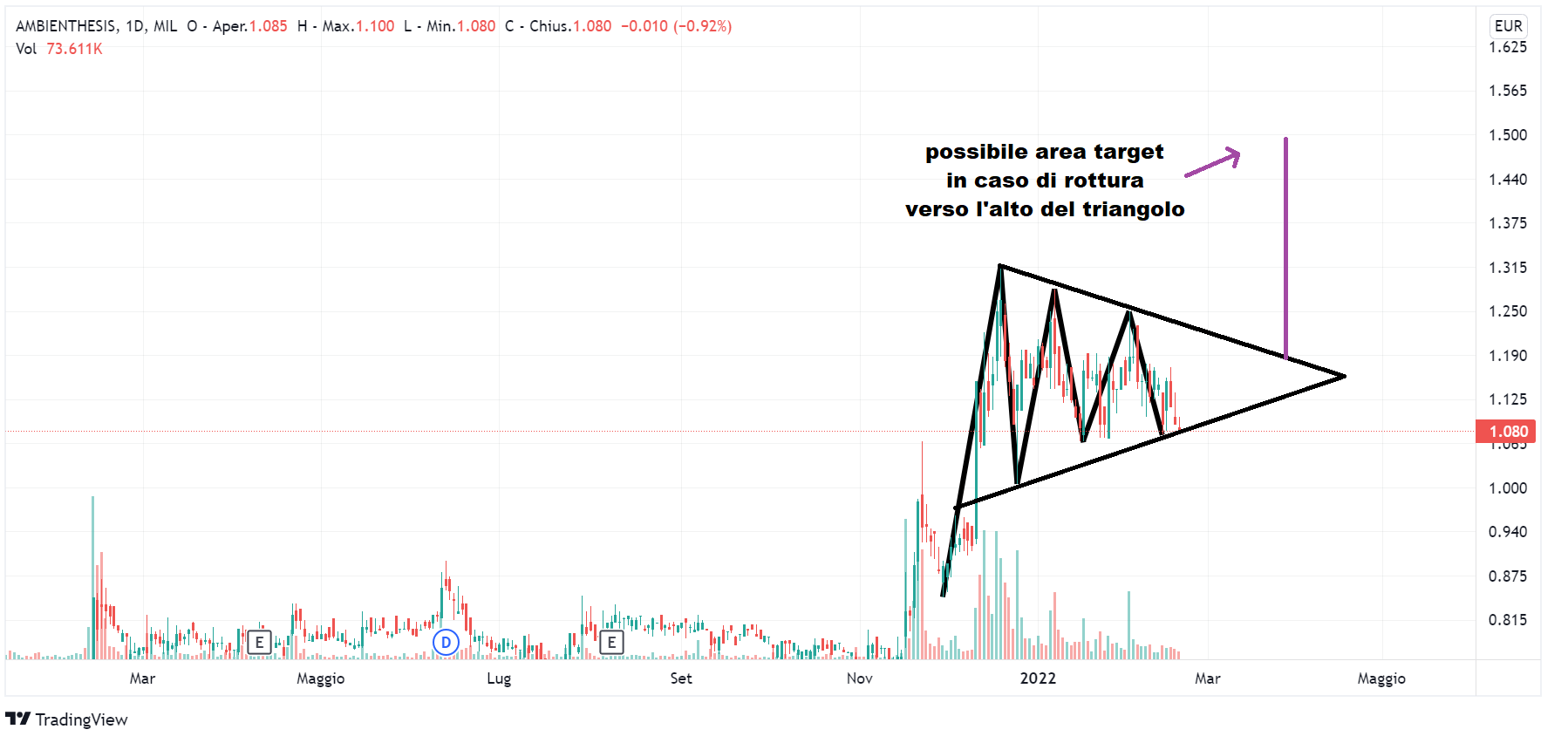 In ultimo dedichiamo spazio al titolo Ambienthesis (venerdì Lombard Stock Index di 28) per il quale avevamo già identificato un triangolo simmetrico “sporco” in precedenza, figura che si è ulteriormente sviluppata nelle ultime sedute. Al momento osservando il grafico notiamo un triangolo delimitato nel lato alto da tre massimi con quotazioni decrescenti di 1,315 (17 dicembre), 1,280 (7 gennaio), 1,250 (2 febbraio). I minimi crescenti invece presentano quotazioni di 1,005 (23 dicembre), 1,065 (17 e 18 gennaio) e 1,075 (14 febbraio).