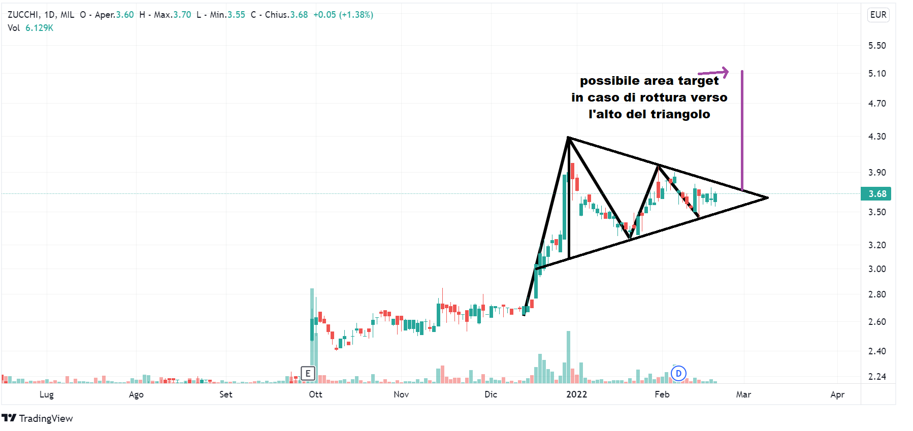 Ancora presente sul grafico di Zucchi (venerdì Lombard Stock Index di 42, secondo più elevato della lista) il triangolo simmetrico indicato la scorsa settimana. La figura è formata dal primo massimo di 4,28 toccato il 29 dicembre, dal minimo di 3,26 del 20 gennaio, seguito dal secondo massimo di 3,96 del 31 gennaio ed il secondo minimo di 3,45 registrato ad inizio settimana, il 14 febbraio.